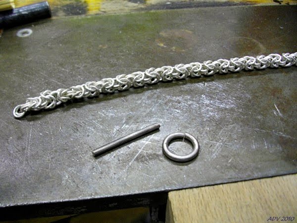 which means: making the silver alloy, pulling round thread to 1mm diameter, making 4mm jumprings, weaving and soldering the rings one by one... i m taking my time, the soldering still makes me a bit nervous, but it seems to be working, can t wait until Christmas (although today it feels like summer) so i can wear it.