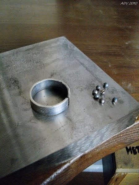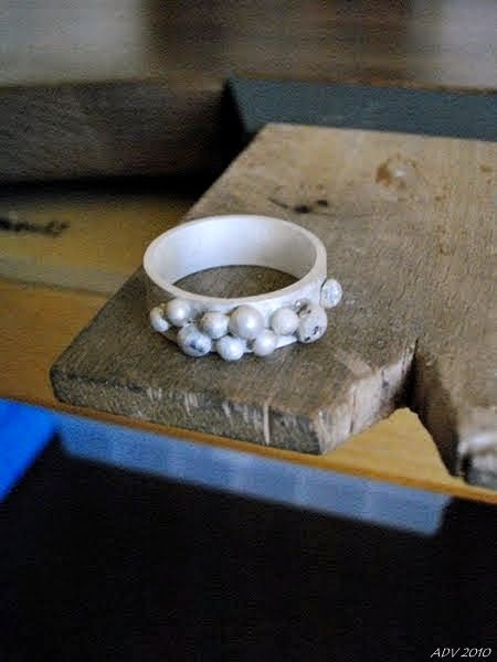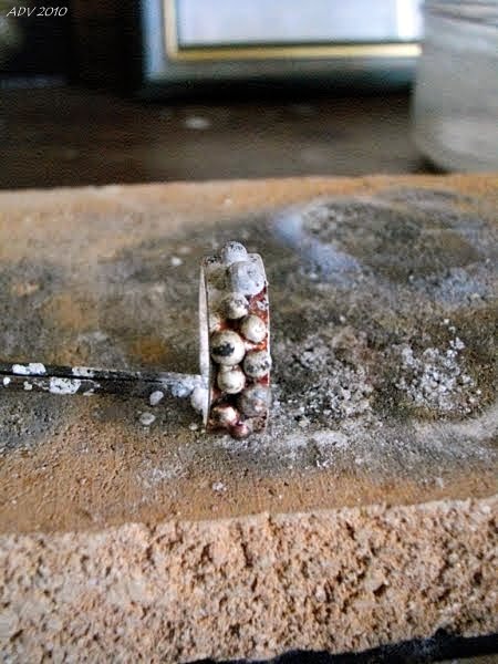 so made a corps, fired up some tiny little balls and started to work... after some mishaps: balls just dropping off, i think because the solder wasn t quite thin enough and the work not hot enough, i finally managed to keep 9 (symbolic number for me) neatly fused to the ring and started polishing...