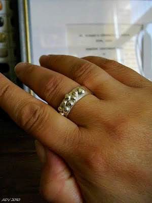 so made a corps, fired up some tiny little balls and started to work... after some mishaps: balls just dropping off, i think because the solder wasn t quite thin enough and the work not hot enough, i finally managed to keep 9 (symbolic number for me) neatly fused to the ring and started polishing...
